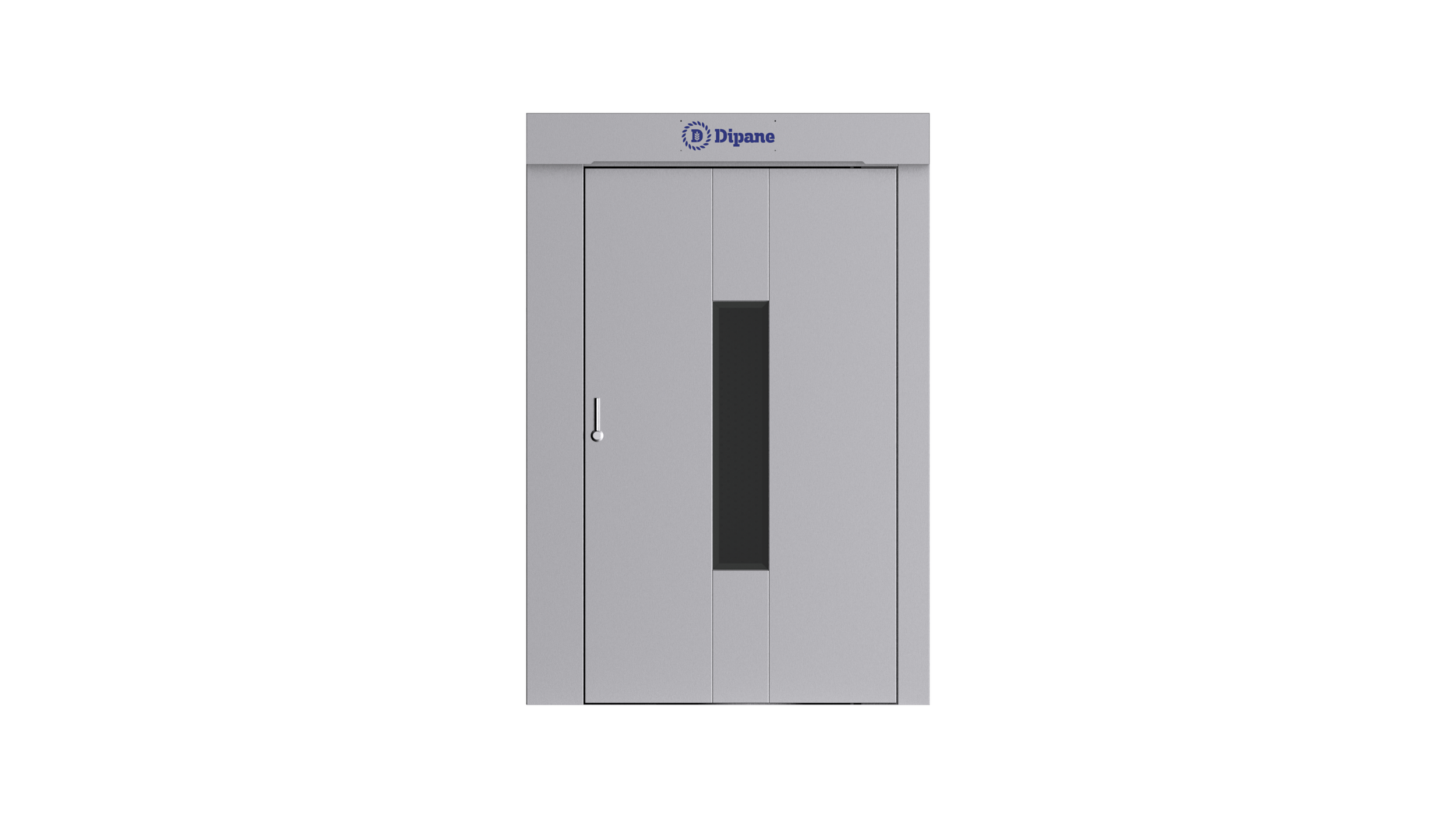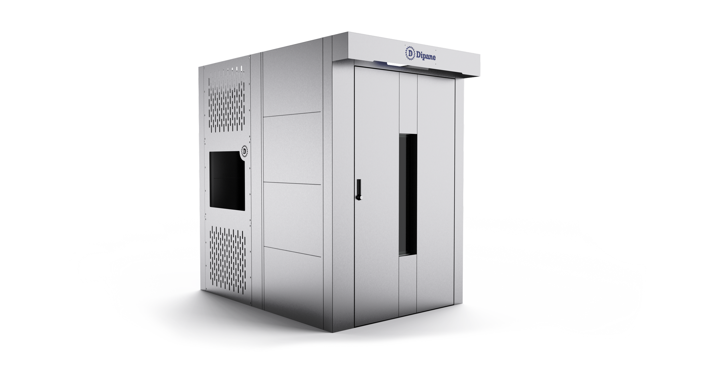 Diseño de horno industrial para panaderías de producción media. Fabricado en acero inoxidable, combina eficiencia térmica, durabilidad y facilidad de limpieza. Su sistema rotativo con vaporizador automático, quemador a gas de 80.000 cal y control de temperatura asegura una cocción pareja y homogénea. Capacidad de hasta 18 bandejas y 140 kg/hora de producción.