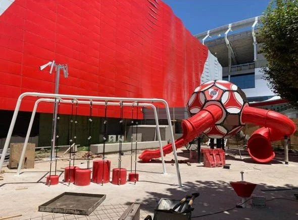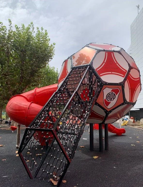 Diseño lúdico con forma de pelota gigante inspirado en la mítica Tango del Mundial ’78. Instalado en dos espacios emblemáticos: el Campo de Juegos de Avellaneda, frente al Museo del Fútbol Argentino, y en el Estadio Monumental de River Plate como parte del área infantil. Ambos integran toboganes, redes y espacios de juego interno, fusionando identidad futbolera, diseño urbano y experiencia interactiva para niños.