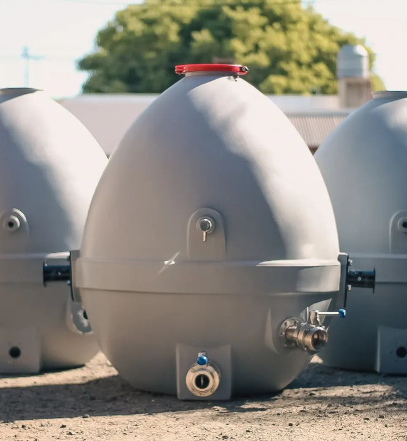 Diseño de recipiente en plástico rotomoldeado para fermentación y almacenamiento de vino, con forma ovoide que favorece la circulación natural de los sedimentos y una crianza más uniforme. Su geometría elimina esquinas muertas, mejorando la microoxigenación sin necesidad de madera.