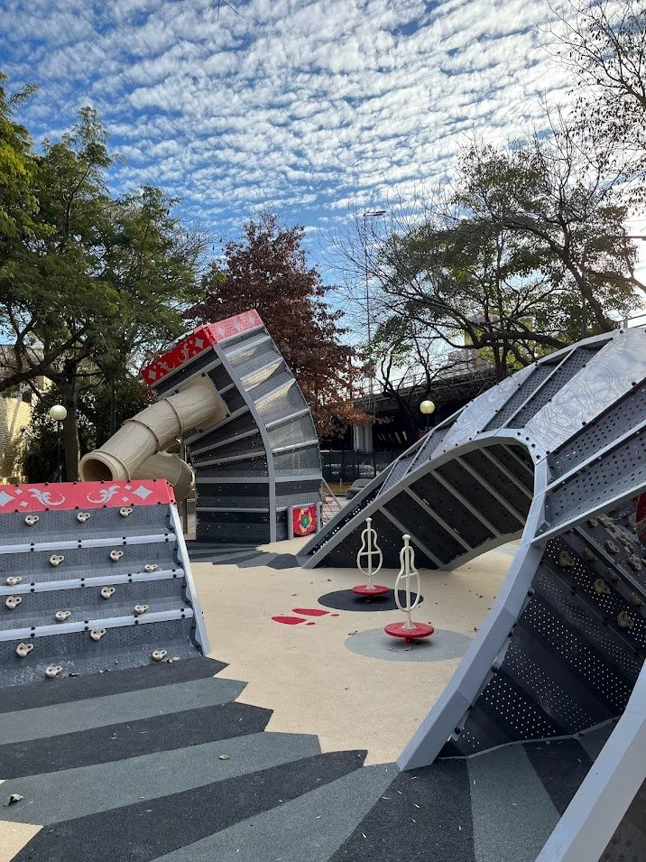 Juego temático conmemorativo diseñado en homenaje a los caídos en la Guerra de Malvinas. Inspirado en el histórico crucero ARA General Belgrano, su estructura recrea la silueta de un buque con torretas, redes, toboganes y elementos náuticos que invitan al juego simbólico y la exploración. Pensado para espacios públicos, combina recreación, memoria y educación, transmitiendo valores de identidad y respeto a las nuevas generaciones.